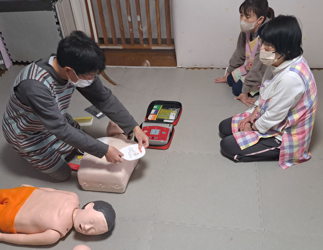 応急手当指導員の資格を持つ保育士による「成人、乳幼児に対する応急手当(胸骨圧迫、人工呼吸、AED)」の訓練が行われました。