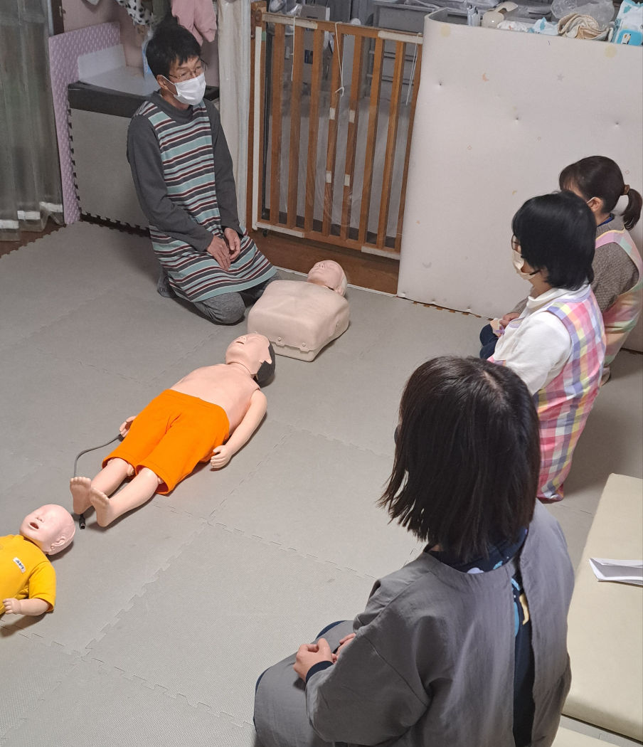 こうして、えなぎ保育園では定期的に職員間で応急処置の仕方を学び、いかなる危機にも対応できる力を身に付けています。
