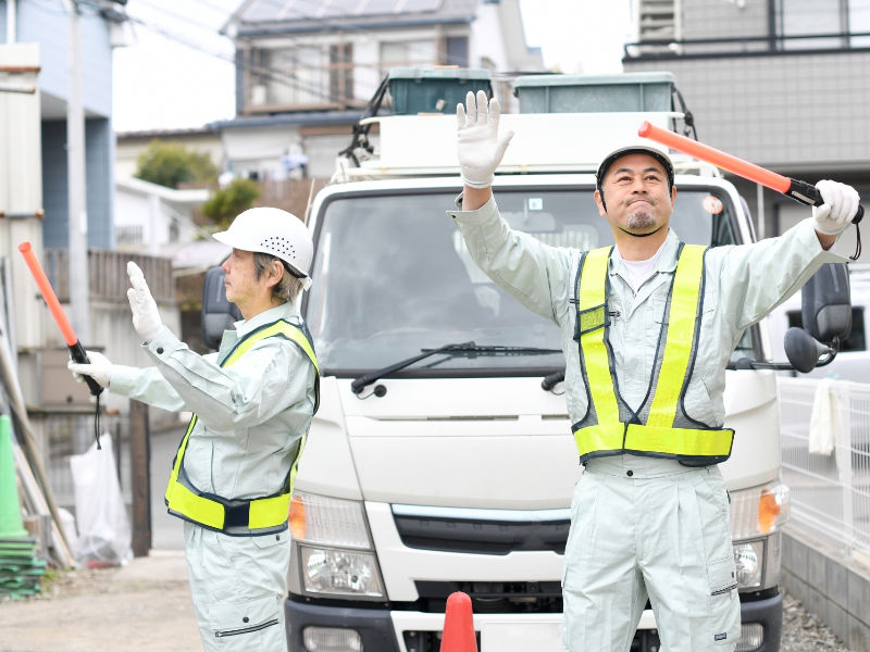 工事現場や駐車場、一般道路などで、車や歩行者の安全を守るお仕事です。