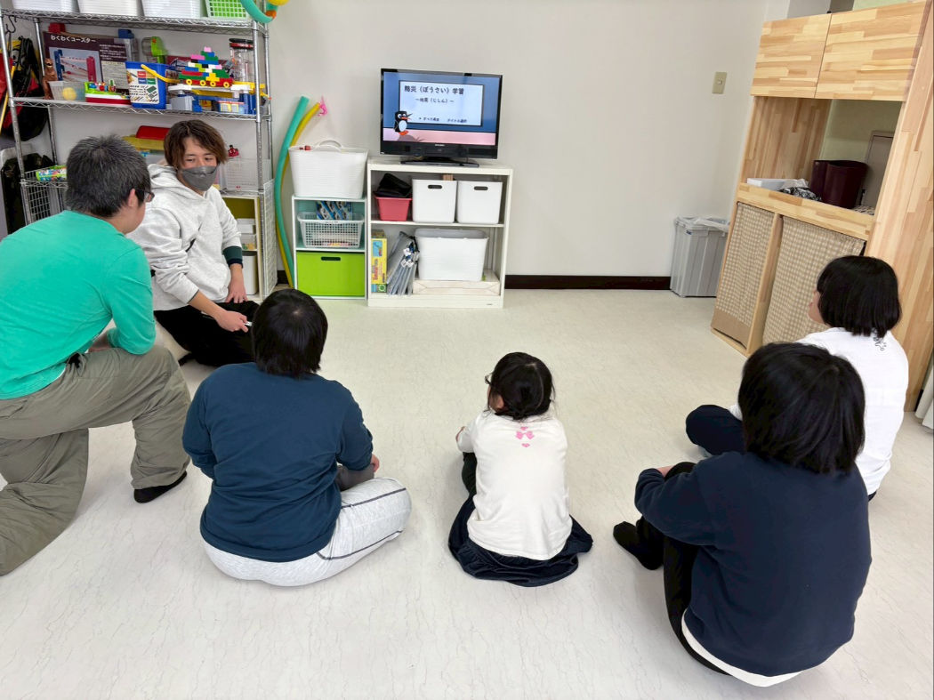 はじめに、ご利用者様と一緒に防災の動画を観て災害時の動きや心構えを学びました。