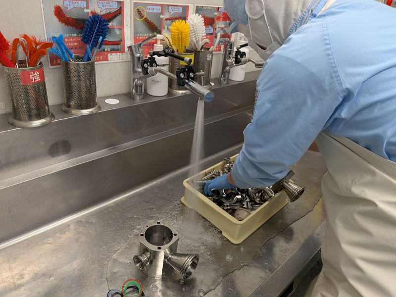 - 化粧品製造で使用した機械部品や容器などを洗浄するお仕事です。