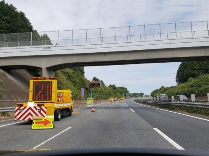 高速道路にて一部の工事区間における交通誘導、一般車両が通行出来ないように機材やカラーコーン等にて車線を規制する業務です。