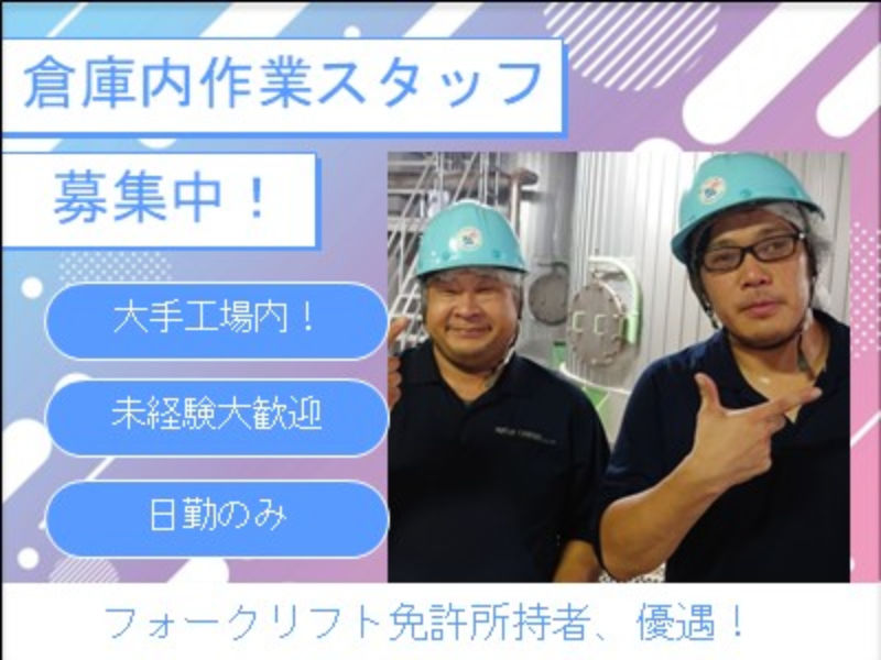 - 【急募】大手工場内での倉庫内作業員(正社員)募集!