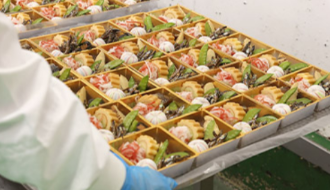- 工場内でのお寿司やお惣菜の