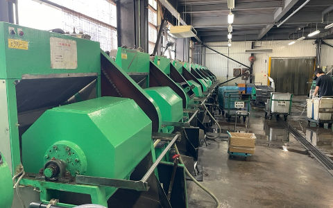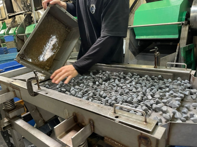 ②バレル研磨機械による研磨が終わった製品の研磨石と製品の選別を機械を用いて行います。