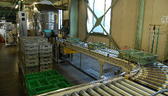 顧客から返却された箱を仕分け、予備洗浄後、機械で洗浄する作業