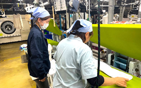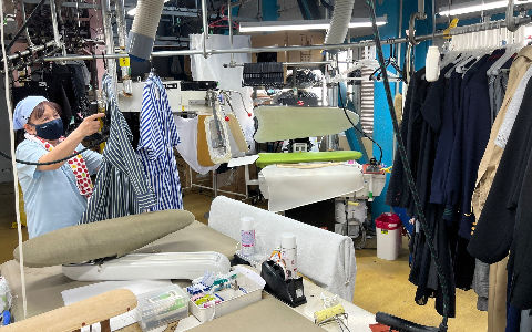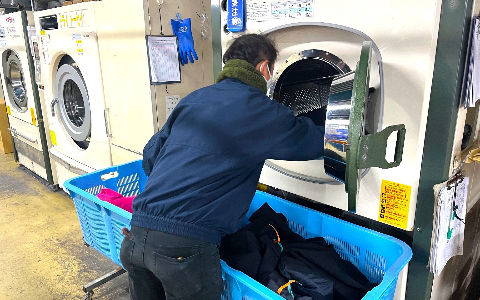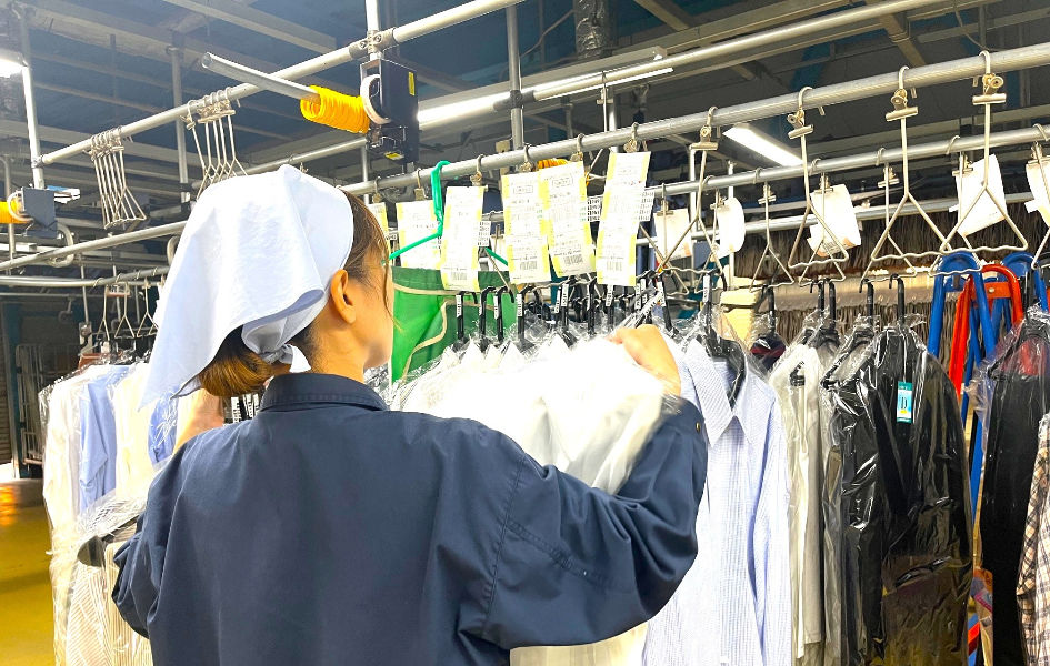 工場スタッフは店舗から搬入された一般衣料品を工場内で洗浄→乾燥→仕上げとそれぞれの工程をこなしています。店舗受付スタッフは、各店舗において、これからクリーニングする衣類をお預かりし、キレイになった商品をお返しする仕事です。