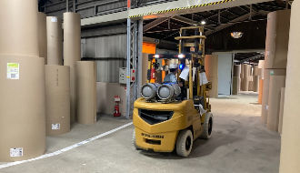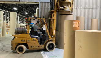 - リフトで段ボール原紙ロールの入庫管理